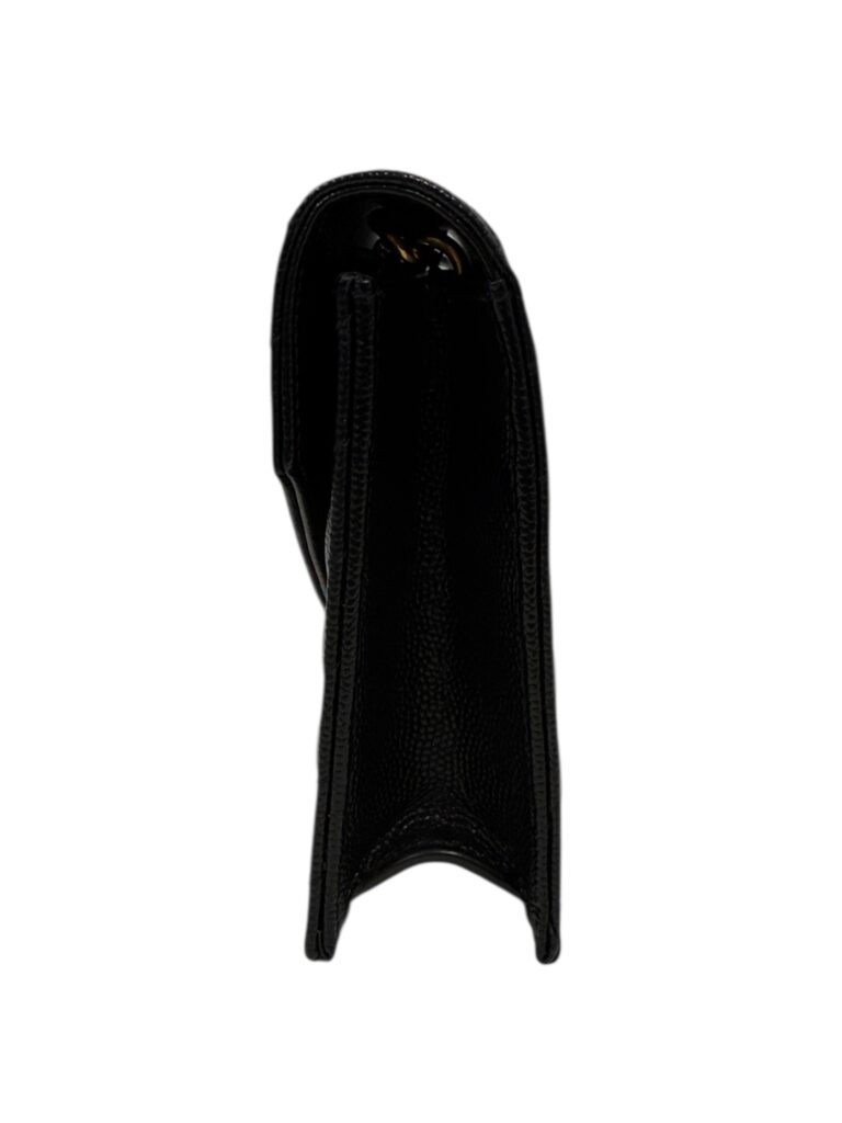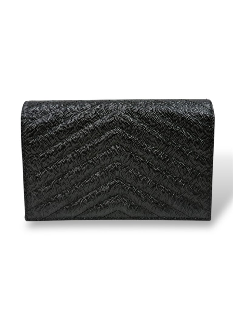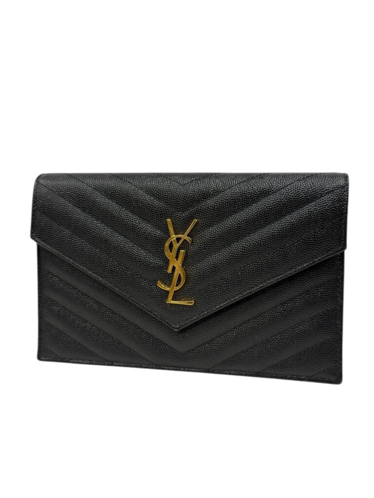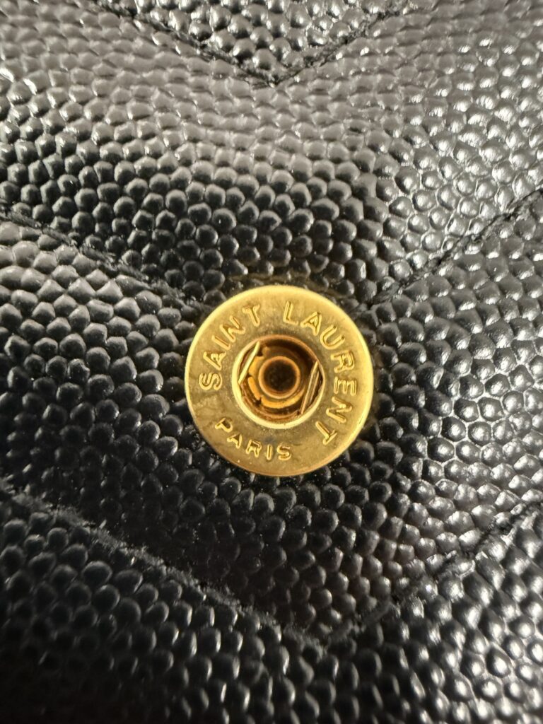 โลโก้ CASSANDRE (YSL) โลหะสีทองหรือเงินรมดำที่วางตัวอย่างสง่างามบนหน้าพับกระเป๋า